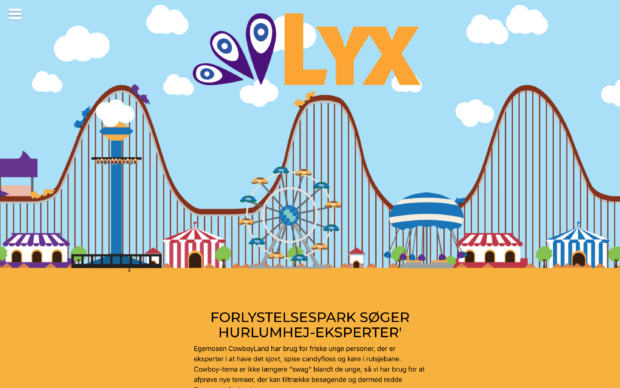 'PLan Lyx: Forlystelsespark søger hurlumhej-eksperter'. Egemosen CowboyLand har brug for friske unge personer, der er eksperter i at have det sjovt, spise candyfloss og køre i rutsjebane. Cowboy-tema er ikke længere “swag” blandt de unge, så vi har brug for at afprøve nye temaer, der kan tiltrække besøgende og dermed redde Egemosen fra konkurs.